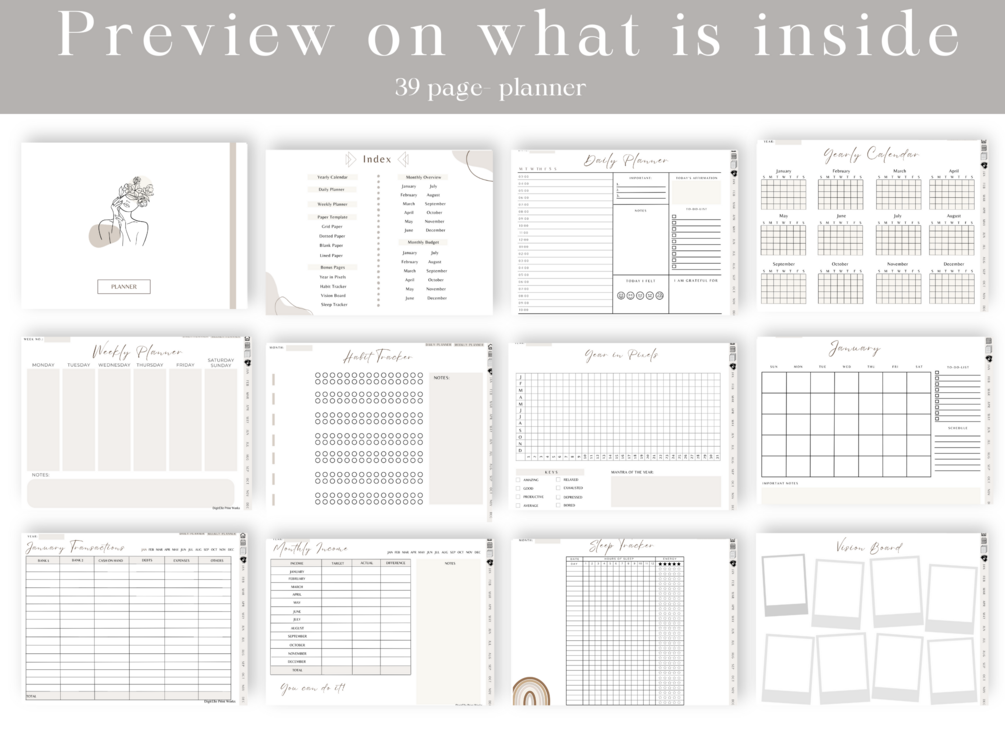 3️⃣ Versatile Functionality: Our minimalist planner isn't just about aesthetics; it's packed with features that enhance your productivity. From goal-setting and habit tracking to note-taking and reflection, our planner covers all aspects of your life. You can prioritize your tasks, set meaningful goals, and track your progress with ease, leading to a more focused and fulfilling life.